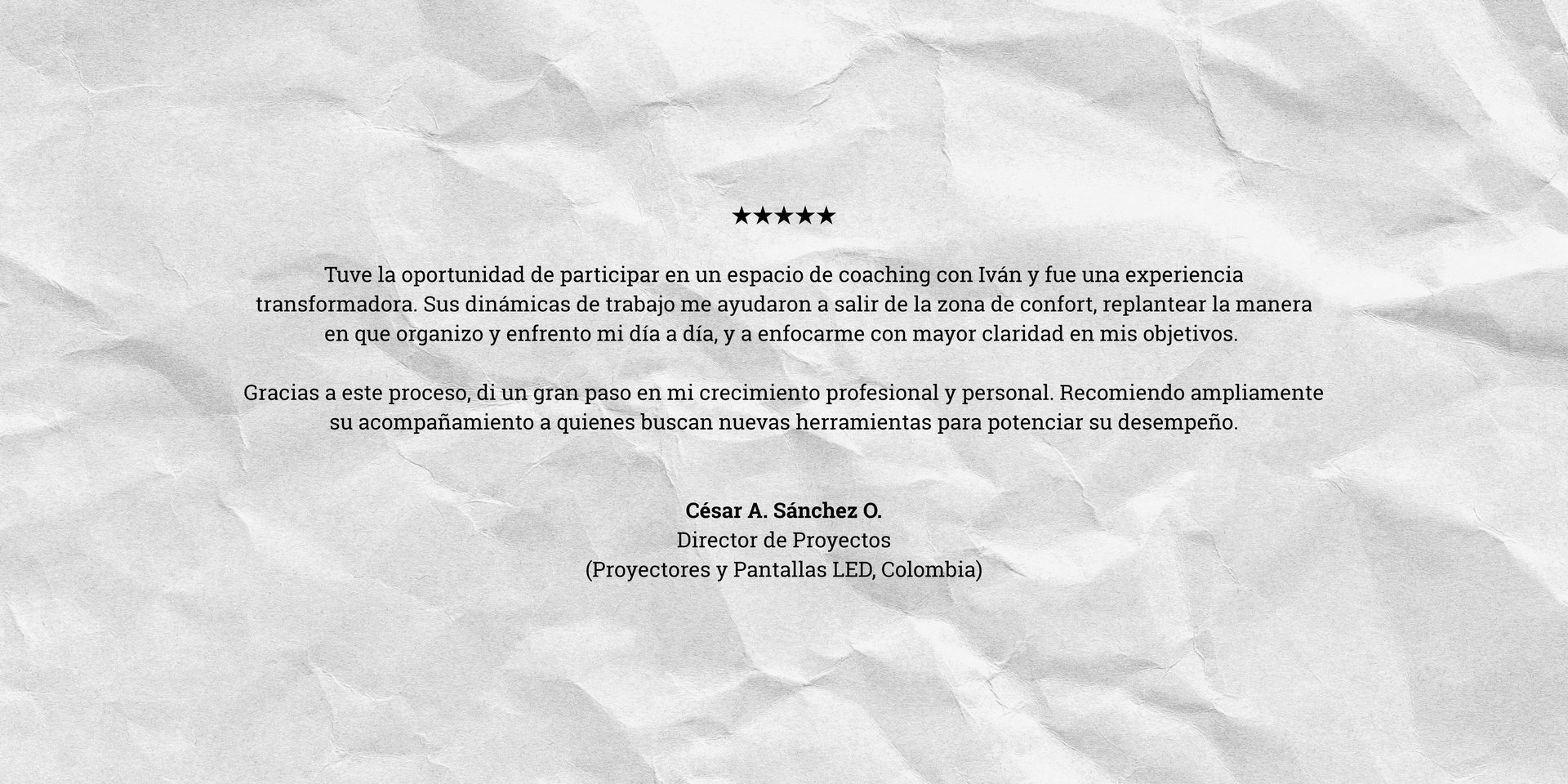 Tuve la oportunidad de participar en un espacio de coaching con Iván y fue una experiencia transformadora. Sus dinámicas de trabajo me ayudaron a salir de la zona de confort, replantear la manera en que organizo y enfrento mi día a día, y a enfocarme con mayor claridad en mis objetivos. Gracias a este proceso, di un gran paso en mi crecimiento profesional y personal. Recomiendo ampliamente su acompañamiento a quienes buscan nuevas herramientas para potenciar su desempeño.